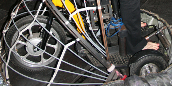 Photo captions and credits: Home page and top: Soprano Anna Christy, as Olympia, with the device that hides under her skirt. Top right: Anna Christy’s long gown leaves no hint she’s got wheels. Middle right: Emily Lange with stagehand John Clarke test the device that propels Olympia. Below: A closer look at the where Anna Christy’s feet go on the scooter that propels her. (Costumed shots by Dan Rest; device images by Joana Olson.)