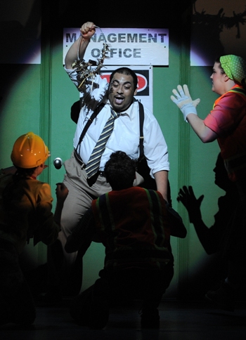 Photo captions and credits: Home page and top: In Shostakovich’s “Moscow, Cheryomushki,” Sophie Gordeladze plays Lusya and Dominic Armstrong is her shy lover Sergei. Descending: Paul LaRosa as Boris and Sara Heaton as Lidochka both dance and sing. Sasha (Adrian Kramer) and Masha (Emily Fons) can’t keep their hands off each other. Bass-baritone Paul Corona is Barabashkin, the building super who doesn’t want to give up apartment keys. Lusya (Sarah Heaton) wields a crane to help friends break into their own apartment. Soprano Ashleigh Semkiw is Vava, the trophy wife. Bass Matt Boehler, Vava’s husband Drebednyov, breaks through a wall with the help of Barabashkin. Below: The set and the dancers. (Production photos by Liz Lauren)