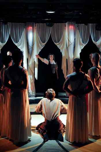 As the independent-minded though hounded Duchess, Justine C. Turner creates a radiant stage presence, no less sympathetic than sagacious. At least in the performance I heard, however, her voice sometimes didn’t project well – no doubt an inherent problem in a theater where seating on three sides of the stage means someone’s usually getting the actor’s back. Yet Davis made himself heard, as did Stephen Dunn, who plays the Duchess’ steward and the man she surreptitiously chooses as her new husband. Dunn and Turner do make a plausible and appealing couple who transcend the mismatched stations of commoner and aristocrat.