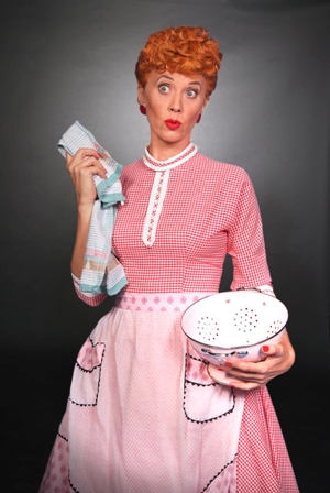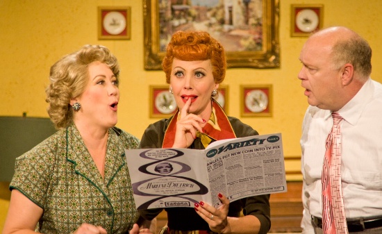 Captions and credits: Home page and above right: Sirena Irwin plays everyone’s favorite redhead. (Photo by Ed Krieger) From top: Chicago actors Joanna Daniels, left, and  Curtis Pettyjohn, right, are Ethel and Fred Mertz to Irwin’s Lucy. (Justin Barbin)  Sirena Irwin publicity photo. Irwin as Lucy in a crying snit. (Justin Barbin) Bill Mendieta as Ricky Ricardo at the Tropicana. (Hyra George) Irwin in Lucy’s classic schemer pose. (Ed Krieger)