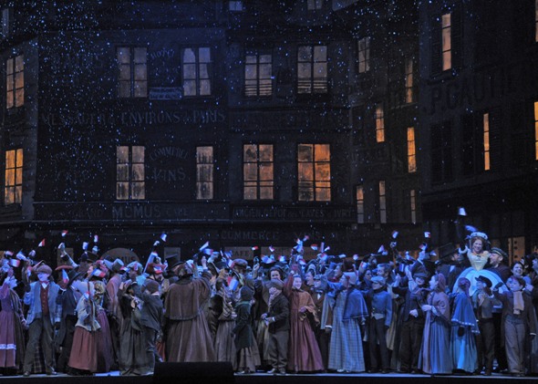 Netrebko and Calleja played out their story on the 1996 sets of Michael Yeargan, created originally for the San Francisco Opera, which worked best in the third act where, at the outskirts of Paris in light snowfall, Mimi and Rodolfo unite after a bitter quarrel and decide to tough it out together until spring. Netrebko and Calleja were rivetting in this duet, where the raw certainty of Mimi’s decline dictates new vows of tenderness.