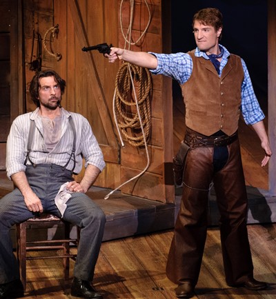 What sets “Oklahoma! apart from mere musical comedy, by raising its dramatic quotient, is the authentically menacing figure of Jud Fry, the creepy hired hand who works on Laurey’s farm and lives like a rat in a smokehouse decorated with naughty pictures. Jud has his fancy set on Laurey. Yet even here, ironically and deliciously, Rodgers and Hammerstein strike a darkly funny vein. Cudia’s Curly and David Adam Moore as Jud make a deadpan screamer of the duet “Pore Jud is Daid,” in which the cowboy suggests this lonely, lowly critter could hang himself and discover the real affection of his mourners.