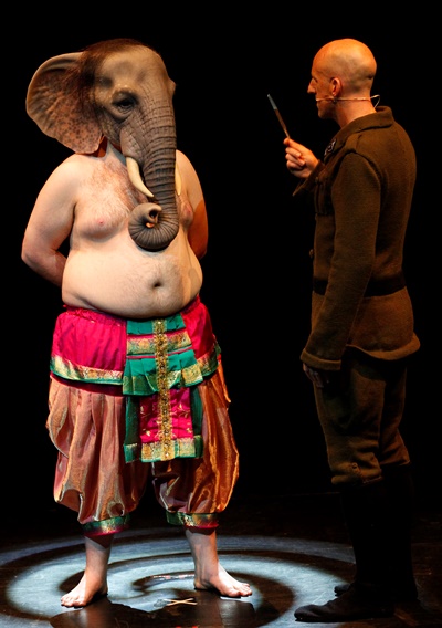 Photo captions and credits: Home page and top: The sly interrogation of a Jew (Simon Laherty, left) by a Nazi official (David Woods) aboard a train is translated from German to English in projected surtitles. Descending: Brian Tilley as the elephant-headed deity Ganesh confronts a Nazi official (David Woods). The supreme Lord Vishnu (David Woods) guides Ganesh on his journey. Simon Laherty as Adolph Hitler. (Photos by Jeff Busby)