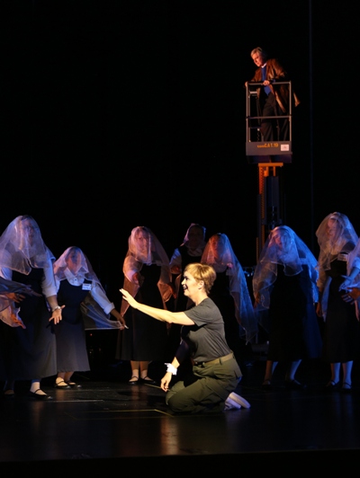 Schweizer gave each of the stars an alter ego in the modern sect — Joan is a shy sister who is reluctant at first to undertake her role; Giacomo doubles as the group’s leader and moral arbiter. (He’s also possessor of an effective tool for spotting the devil — his very own high hide, compliments of designer Magaw.) The choristers are first seen in the overture, as viewers of the 1948 Ingrid Bergman film about Joan of Arc, which is trimmed — not badly — to coincide with the dramatic course of the overture.