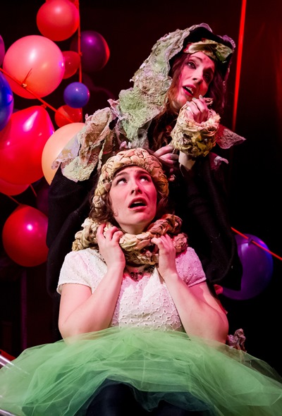 What “Into the Woods” must be first of all is charming; the shadows fall later. And The Hypocrites’ lovely production exudes charm – on a set devised by William Boles where strung balloons represent the enveloping woods, a child’s slide serves as the tower where Rapunzel is kept by a witch and a small house-shaped shadow box provides the frame for the sad fate of Red Riding Hood’s granny.