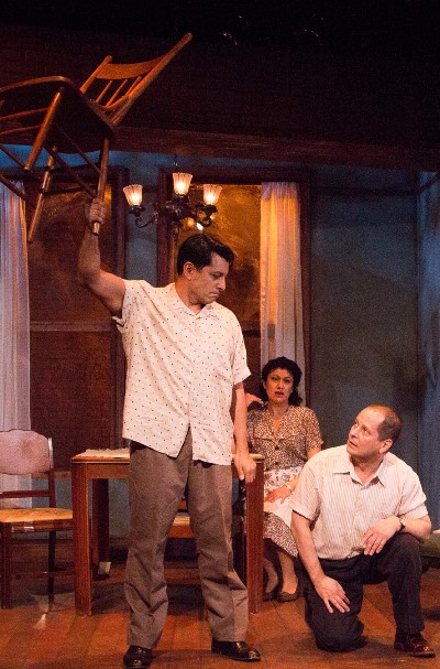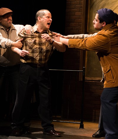 An angry Eddie (Ramón Camín, center) is restrained by Lipari (Joel Maisonet, left) and Louis (Todd Garcia). (Javier Maisonet)Ramón Camín’s tormented Eddie is a marvel to witness. Arthur Miller carefully sculpted the arc of Eddie’s misery-to-madness, allowing us to see him early as a malleable father-figure who can be persuaded to cave like any dad when mom and daughter team up. And Camín portrays the good guy with sly indulgence: He can cut Catherine some slack, play out a little of this string invisibly attached to his dove.