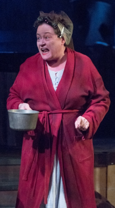 She sleeps (lightly, and with a flashlight) in the front hall, the better to monitor the comings and goings of her tenants. Her temper’s in perpetual simmer and, when sufficiently provoked by the unsavory behavior of her residents, known to boil over. Yet there are traces of gold in that black heart, and the old woman has a soft spot for the Writer (if only because she confuses him with her departed son). In this place of torment and suspended dreams, Montemurro brilliantly mercurial performance taps deeply into a demonic minder of souls.