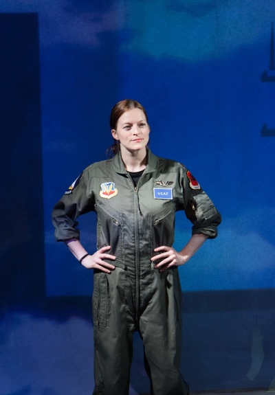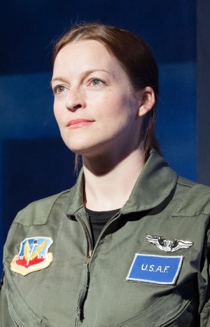 This pilot, a U.S. Air Force fighter pilot, is the sort of jock you might expect: a lone wolf who’s only really happy up there in the wild blue yonder, at the controls of an F-16 that even has a name, Tiger, and homing in on targets in the midst of a Middle East war, launching rockets that deconstruct domes and minarets back into sand. Yet there’s a mentionable wrinkle. The Pilot in playwright George Brant’s monodrama “Grounded” is a woman.