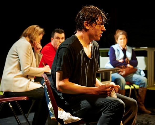 As the science teacher Thulin carries the greater weight of the play. In a sympathetic and well-calibrated portrayal, Thulin’s Erika Roth sees her position — as a teacher of science, which should be about science — as unassailable. But that idea is subjected to siege from various sides in what becomes a very dark comedy. She descends from tentatively earnest attempts to help Benjamin understand the curriculum, to exasperation, obsession, and ultimately to acts of extreme desperation at the edge of rationality, in her panic to preserve her sense of self. Which is where her arc, and Benjamin’s, cross from different directions.