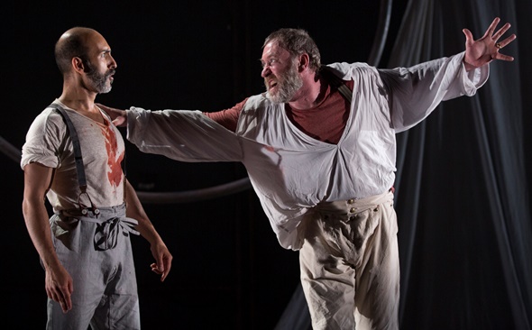 The spirit, and sometimes the specific letter, of Shakespeare permeates “Moby Dick” and specifically the character of Ahab. In Donahue’s ranting, brooding, oblivious Captain we see a melding of that remorseless schemer Richard III and the unmoored Lear. Then there’s the “Hamlet” moment when desperate, disillusioned Starbuck has his pistol cocked and pointed at Ahab’s back (is this Claudius praying?), but pauses to contemplate the law and decides on the righteous course.
